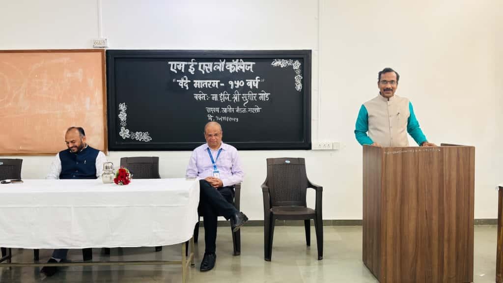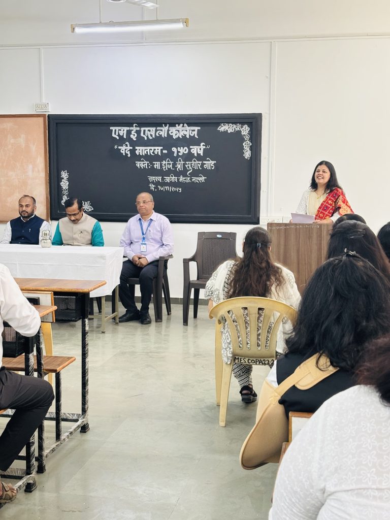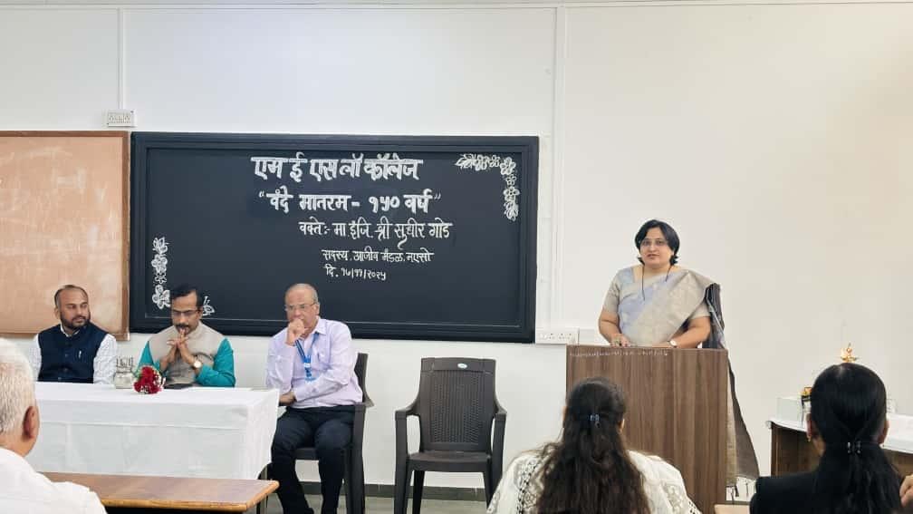 त्या निमित्त, एम ई एस लॉ कॉलेज पुणे येथे १७ नोव्हेंबर २०२५ रोजी ‘वंदे मातरम् – १५० वर्ष’ या कार्यक्रमाचे आयोजन करण्यात आले. कार्यक्रमाला वक्ते म्हणून म ए सो आजीव मंडळ सदस्य मा. इंजि. श्री. सुधीर गाडे सर यांची उपस्थिती लाभली. तसेच म ए सो चे मुख्यकार्यकारी अधिकारी श्री. सचिन अंबर्डेकर सर आणि महाविद्यालयाचे महामात्र डॉ. गोविंद कुलकर्णी सर हे हि उपस्थित होते.